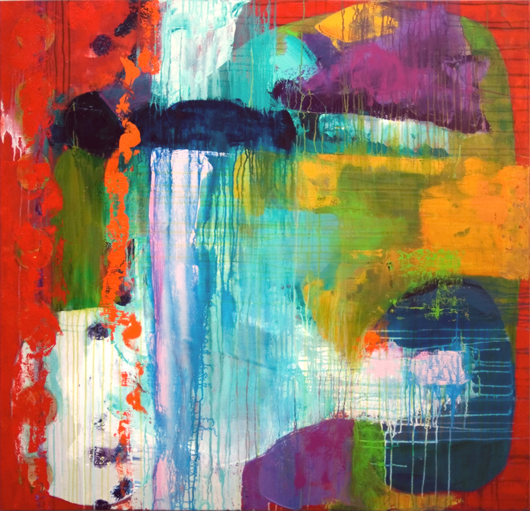 This artist loves working on large canvases. Using techniques borrowed from printmaking as well as traditional painting the artist applies pigment to canvas in a random/organized way, using brushes, knives and fingers. Slathering on the paint, washing paint away, searching for a new way to create expressive, interesting pieces, the artist scratches, scrapes and marks the wet paint. These techniques are employed in the “Word” paintings as well where writing from experience takes center stage. The playful creation of work follows from her philosophy of life: Learn something new every day and put it to use tomorrow.