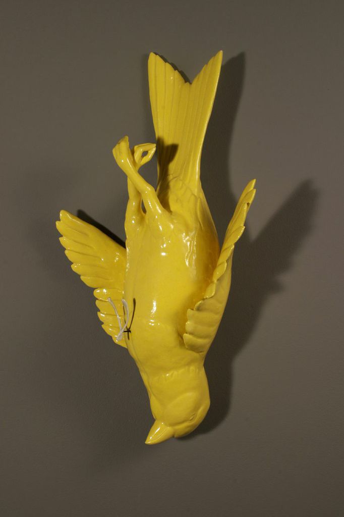 This body of work is inspired by the genre of still life painting (functioning traditionally as a reminder of mortality) and particularly by the compositions of Chardin. Simplified but realistic representations of game animals are forcefully combined and contrasted with cartoonishly glazed and artificially bright and vibrant elements (dripping oranges, bright yellow canaries, flowing drips). The glazed elements are generally pushed into the wet clay of the larger sculpture, and the entire sculpture is dried, fired, and re-fired together, resulting in many cracks and stresses. This process and the whole jarring composition are meant to correlate with the complexity and strain of our attempt to understand our mortality in its entirety.